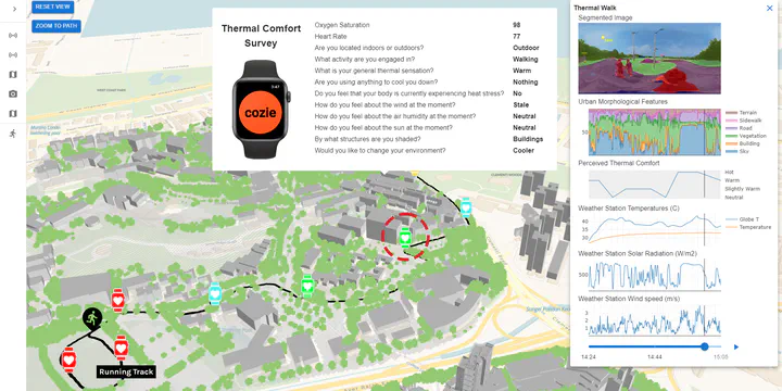 This research examines the interplay of outdoor thermal comfort, walkability, and three-dimensional geospatial landscape within cities. Employing advanced data collection methods, including smart wearables and street view imagery (SVI), we conduct a comprehensive exploration of integrating heterogeneous sensor data and computer vision in an urban digital twin (UDT) we develop. We focus on the integrated thermal walk concept, where participants, equipped with wearables, contribute health metrics and real-time thermal sensation feedback while walking along selected routes for which we collect detailed 3D geoinformation, which in turn provides a foundation for understanding and improving comfort and walkability in cities. Our study not only addresses the integration, but also underscores the transformative role of advanced analytics and UDT in deciphering how urban morphology influences thermal experiences. While the growing accessibility of wearable devices facilitates work such as ours, we highlight challenges in collecting diverse participant data and the imperative need for specialized expertise in UDT and computer vision. This research contributes to (1) digital twins, providing a novel combination of data integration and a new use case, and to (2) urban climatology, advancing our understanding of the relationship among microclimate, urban environment, and outdoor thermal comfort. Beyond theoretical contributions, the study’s practical significance is revealed in the development of accurate predictive models for understanding walkability, promising improvements in the quality of urban life, and pronouncing the important role of 3D geoinformation in such a domain.